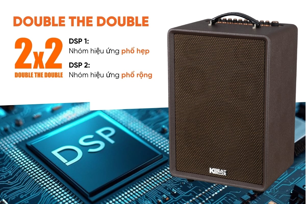 Hệ thống xử lý âm thanh trang bị 2 chip DSP độc lập, đảm nhận các tác vụ tách biệt: một chip tối ưu giọng hát, chip còn lại tinh chỉnh nền nhạc. Nhờ đó, hiệu ứng được nhân đôi (double the double), tạo độ vang, dày và rõ rệt hơn so với các dòng loa thông thường. Sự kết hợp này giúp cân bằng dải tần, giữ được độ chi tiết của nhạc nền mà không lấn át giọng ca, cho ra âm thanh ổn định, sắc nét và kiểm soát tốt ở nhiều mức âm lượng.