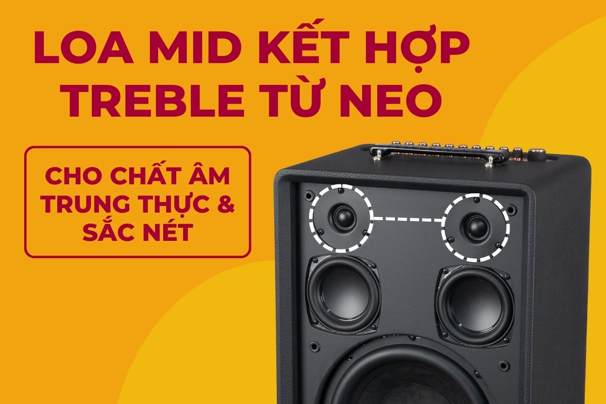 Soncamedia AURIS được thiết kế với hệ thống loa MID kết hợp cùng TREBLE từ Neo, mang đến chất âm trung thực và sắc nét ở dải trung cao. Loa MID đảm nhiệm việc tái hiện giọng hát và nhạc cụ chính với độ rõ ràng cao, trong khi tweeter từ Neo cho dải cao sáng, mượt và không gây chói. Sự kết hợp này tạo nên âm thanh cân bằng, giàu chi tiết, phù hợp cả khi hát karaoke lẫn nghe nhạc. Công nghệ từ Neo còn giúp giảm trọng lượng tổng thể của loa mà vẫn đảm bảo công suất mạnh mẽ và độ bền cao.