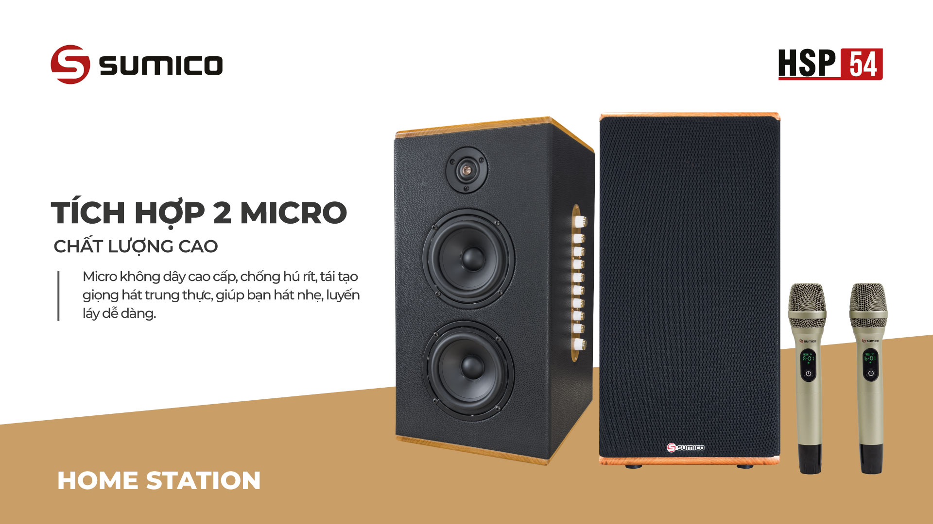 Sumico HSP54 thiết kế thùng loa kỹ thuật cao cùng củ loa được đặc chế riêng tạo hiệu suất lớn, tái tạo âm thanh sống động với tiếng Bass mạnh mẽ, trung âm dày dặn tự nhiên và dải cao chi tiết không chói gắt. Với tính năng tùy chỉnh hiệu ứng kết hợp Echo, Delay và Reverb giúp tiếng hát karaoke dịu ngọt ngân vang bay bổng nhưng không vang vọng quá lớn dễ gây ồn ào làm phiền không gian xung quanh như các dòng loa karaoke phổ thông.