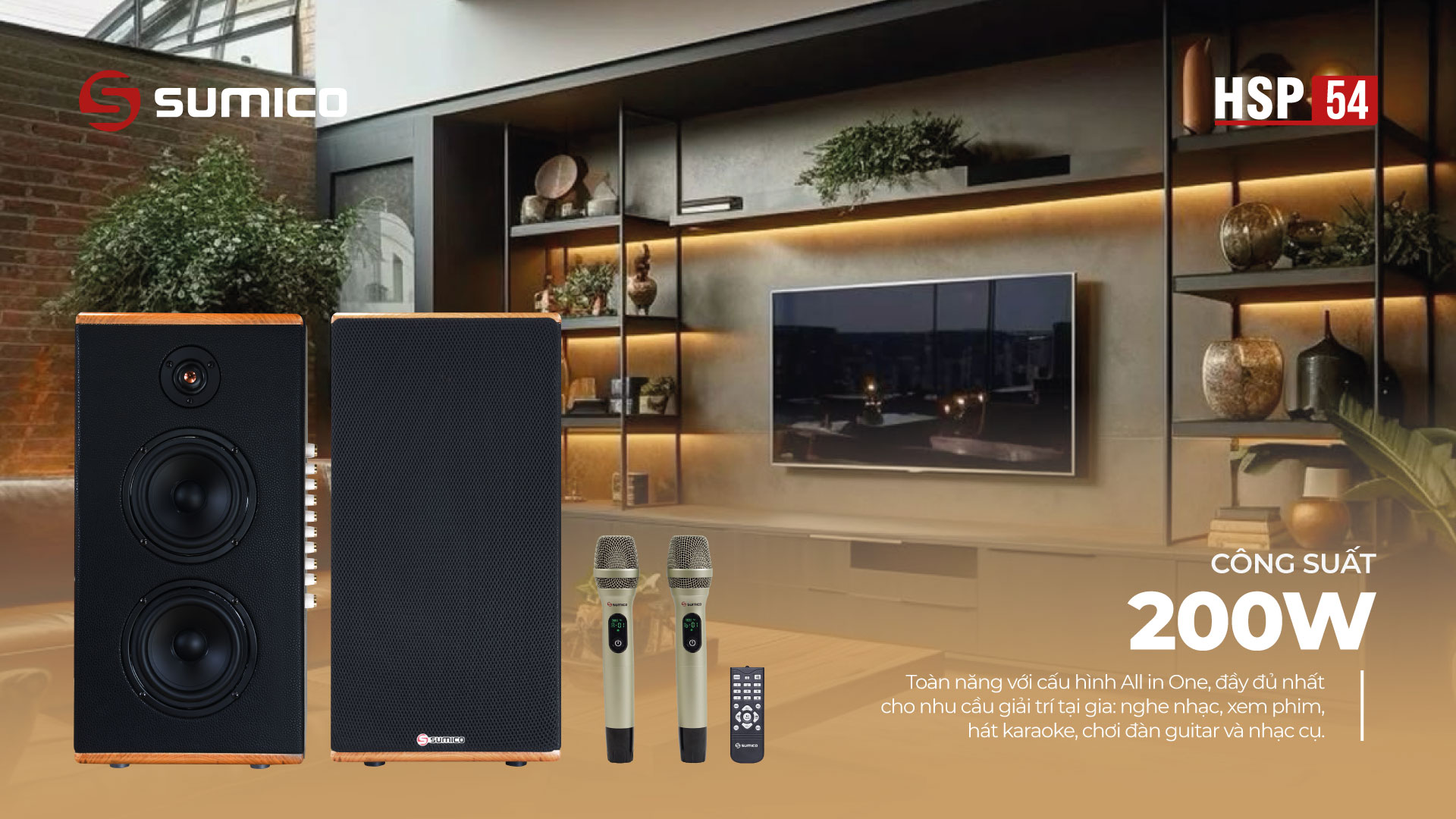 Loa Sumico HSP54 là lựa chọn "3 trong 1" thông minh cho gia đình hiện đại sử dụng Karaoke, nghe nhạc, xem phim giải trí thư giãn kết hợp chơi đàn hát live tiệc tùng. Với hiệu năng vượt trội so với tầm giá, đây là sản phẩm rất đáng sở hữu nếu bạn đang tìm kiếm một thiết bị âm thanh toàn diện mà không cần đến hệ thống loa phức tạp.