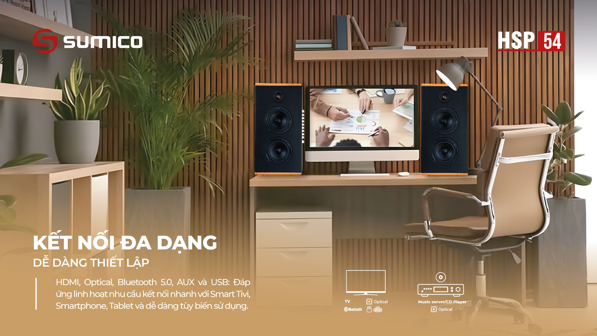 Sumico HSP54 đem lại giá trị sử dụng cao cấp với tính năng phong phú và âm thanh vượt trội, là sự lựa chọn hoàn hảo cho người yêu nhạc, mê phim, chơi đàn và hát karaoke cần một mẫu loa kê đặt gọn gàng.