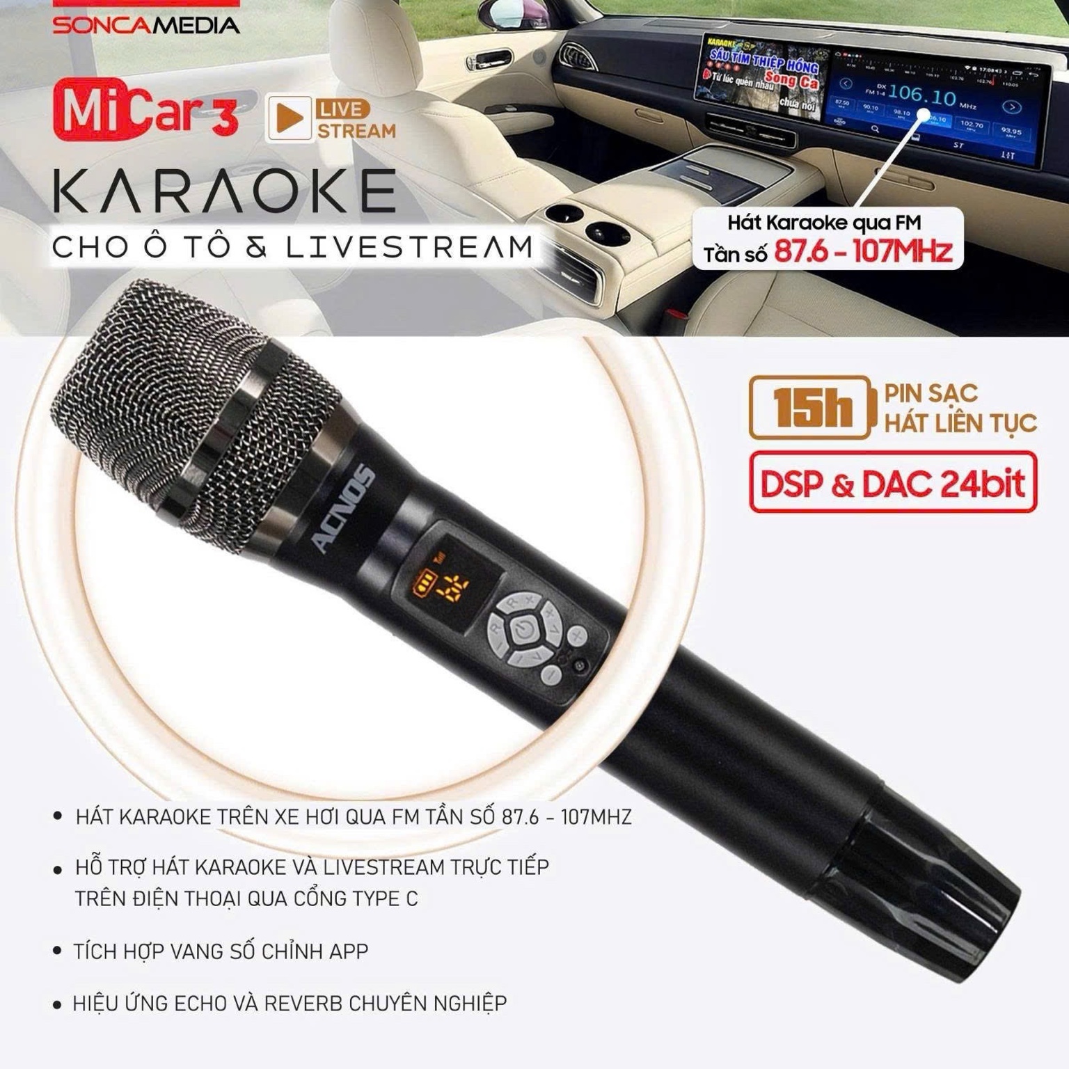 ACNOS Soncamedia MiCar 3 Live là chiếc micro tích hợp vang số, Bluetooth 5.0 và phát FM giúp bạn hát karaoke ngay trên xe hơi, xe du lịch hoặc xe khách mà không cần hệ thống phức tạp. Ngoài ra, tính năng livestream âm thanh số chất lượng cao giúp sản phẩm trở thành lựa chọn số 1 cho các streamer, nhạc sĩ, và người sáng tạo nội dung.